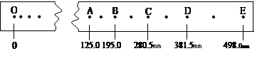(2)在“验证机械能守恒定律”的实验中,所用电源的频率为50Hz,某同学选择了一条合理的纸带,用刻度尺测量时各计数点对应刻度尺上的读数如图所示,数值的单位是mm;图中O点是打点计时器打出的第一个点,A、B、C、D、E分别是每打两个点取出的计数点。设重物的质量为1kg,(当地重力加速度g=9.8m/s2.)