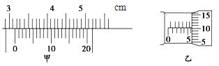1、实验题 (4分)用20分度的游标卡尺测物体的长度,如图甲所示,读数为________ cm。用螺旋测微器测物体的厚度,如图乙所示,读数为________ mm。