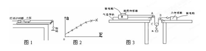 (3)几位同学分析所得到的a-F图线不是一条直线的原因后,重新设计了一个实验如图3所示,滑块M放在气垫导轨上,并在滑块上固定一个速度传感器,力传感器固定在另一水平台子上,分别与两台电脑相连,气垫导轨连上气泵并调成水平。多次改变钩码m的质量,由速度和力传感器可以得到多组不同的加速度a、力F的值。则下列说法中正确的是 :(? )?
