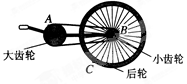 5、选择题  图示为某品牌自行车的部分结构。A、B分别是飞轮边缘、大齿盘边缘上的点。飞轮14齿,大齿盘42齿。现在提起自行车后轮,转动脚蹬,使大齿盘和飞轮转动,则下列说法正确的是