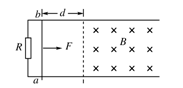 5、计算题 如右图所示,两根平行金属导轨固定在同一水平面内,间距为l,导轨左端连接一个电阻R.一根质量为m、电阻为r的金属杆ab垂直放置在导轨上.在杆的右方距杆为d处有一个匀强磁场,磁场方向垂直于轨道平面向下,磁感应强度为B.对杆施加一个大小为F、方向平行于导轨的恒力,使杆从静止开始运动,已知杆到达磁场区域时速度为v,之后进入磁场恰好做匀速运动.不计导轨的电阻,假定导轨与杆之间存在恒定的阻力.求: