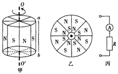 1、选择题 某学习小组设计了一种如图甲所示的发电装置,其俯视图如图乙所示。将8块外形相同的磁铁交错放置组合成一个高h=0.5 m、半径r=0.2m的圆柱体,其可绕固定轴OO"逆时针(俯视)转动,角速度ω=100 rad/s。圆柱外侧附近每个磁场区域的磁感应强度大小均为B=0.2 T、方向都垂直于圆柱体侧表面,紧靠圆柱体外侧固定一根与其等高、电阻R1=0.5 Ω的细金属杆ab,杆与轴OO"平行。图丙中阻值R=1.5 Ω的电阻与理想电流表A串联后接在杆a、b两端。下列说法正确的是