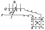 4、计算题 如图所示,P、Q为水平面内平行放置的光滑金属长直导轨,间距为L1,处在竖直向下、磁感应强度大小为B1的匀强磁场中。一导体杆ef垂直于P、Q放在导轨上,在外力作用下向左做匀速直线运动。质量为m、每边电阻均为r、边长为L2的正方形金属框abcd置于竖直平面内,两顶点a、b通过细导线与导轨相连,磁感应强度大小为B2的匀强磁场垂直金属框向里,金属框恰好处于静止状态。不计其余电阻和细导线对a、b点的作用力。