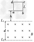 5、选择题 如图所示,相距为d的两水平虚线L1、L2之间有方向垂直纸面向里的匀强磁场,磁感应强度为B,正方形线圈abcd的边长为L(L<d)、质量为m、电阻为R。现将线圈在磁场上方高h处由静止释放,ab边刚进入磁场时的速度和刚离开磁场时的速度相同,在线圈全部穿过磁场过程中,下列说法正确的是