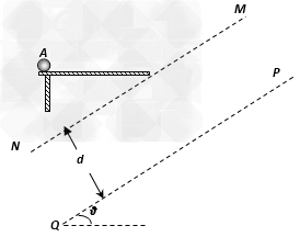 4、计算题 如图所示,光滑的平台水平固定,在平台右下方有相互平行的两条边界MN与PQ,其距离为d=1.36m,MN过平台右端并与水平方向呈θ=37°.在平台最左端放一个可视为质点的A球,其质量为mA=0.1kg,现给A球一水平初速度,使其飞出平台后,能垂直PQ边界飞出.已知g=10m/s2,sin37°=0.6,cos37°=0.8.求: