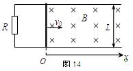 5、计算题  如图14所示,两条足够长的互相平行的光滑金属导轨位于水平面内,距离为L=0.5m.在导轨的一端接有阻值为0.8Ω的电阻R,在x≥0处有一与水平面垂直的匀强磁场,磁感应强度B=1T.一质量m=0.2kg的金属杆