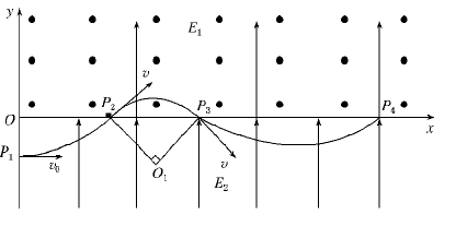 4、计算题 如图所示,坐标系中第一象限有垂直纸面向外的匀强磁场,磁感应强度B=102 T,同时有竖直向上与y轴同方向的匀强电场,场强大小E1=102 V/m,第四象限有竖直向上与y轴同方向的匀强电场,场强大小E2=2E1=2×102 V/m.若有一个带正电的微粒,质量m=10-12 kg,电量q=10-13 C,以水平与x轴同方向的初速度从坐标轴的P1点射入第四象限,OP1="0.2" m,然后从x轴上的P2点穿入第一象限,OP2="0.4" m,接着继续运动.取g=10? m/s2.求: