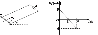 3、计算题  (15分)如图所示,处于匀强磁场中的两根足够长、电阻不计的平行金属导轨相距m,导轨平面与水平面成角,上端连接阻值为的电阻.匀强磁场方向与导轨平面垂直,磁感应强度T.质量为kg、电阻为的金属棒,以初速度从导轨底端向上滑行,金属棒在安培力和一平行于导轨平面的外力的共同作用下做匀变速直线运动,速度-时间图像如图所示.设金属棒与导轨垂直并保持良好接触,它们之间的动摩擦因数为.(m/s2,),求: