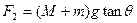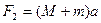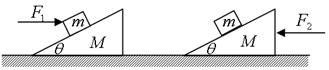 2、计算题 (10分)如图所示,质量M的斜面体置于水平面上,其上有质量为m的小物块,各接触面均无摩擦。第一次将水平力F1加在m上;第二次将水平力F2加在M上,两次都要求m与M不发生相对滑动。求:F1∶F2=?
