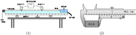 5、填空题  某实验小组利用如图所示的实验装置来探究当合外力一定时,物体运动的加速度与其质量之间的关系.(1)由图中刻度尺读出两个光电门中心之间的距离为s厘米,由图中游标卡尺测得遮光条的宽度d=______厘米.该实验小组在做实验时,将滑块从图9所示位置由静止释放,由数字计时器可以读出遮光条通过光电门1的时间△t1,遮光条通过光电门2的时间△t2,则滑块经过光电门1时的瞬时速度的表达式v1=______,滑块经过光电门2时的瞬时速度的表达式v2=______,则滑块的加速度的表达式a=______.