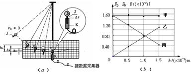小题1:某同学用DIS研究“机械能守恒定律”的装置如图(a)所示,在一次实验中,选择DIS以图像方式显示实验的结果,所显示的图像如图(b)所示。图像的横轴表示小球距D点的高度h,纵轴表示摆球的重力势能Ep、动能Ek或机械能E。试回答下列问题: