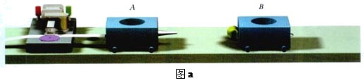 2、实验题 用“碰撞实验器”可以验证动量守恒定律,如图a所示,在光滑水平桌面上有A、B两个质量相等的小车,A车的车尾拖着一穿过打点计时器的纸带,A车以某速度与静止的B车相碰,碰撞后两车连在一起共同运动,