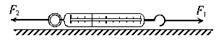 1、选择题 如图所示,某一弹簧秤外壳的质量为m,弹簧及与弹簧相连的挂钩质量忽略不计,将其放在水平面上.现用两水平拉力F1、F2分别作用在与弹簧相连的挂钩和与外壳相连的提环上,则关于弹簧秤的示数,下列说法正确的是( )