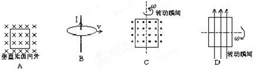 本题解析:A中当线圈垂直纸面向外运动时,线圈导线的运动方向与磁感线平行,不切割磁感线,故不产生感应电流,A不对;B中的通电直导线产生的磁场与直导线垂直,故穿过线圈的磁通量为0,当线圈运动时,穿过它的磁通量仍为0,没有变化,故不产生感应电流,B也不对;C在转动瞬间,线圈的左右两边不切割磁感线,穿过闭合线框的磁通量最大,变化率为零,故不产生感应电流,C是不对的;D中在转动的瞬间,线圈的两边切割磁感线运动,故产生感应电流,所以D是正确的。