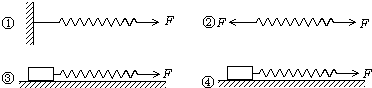 2、选择题 如图所示,四个完全相同的弹簧都处于水平位置,他们的右端受到大小皆为F的拉力作用,而左端的情况各不相同:①中弹簧的左端固定在墙上,②中弹簧的左端受大小也为F的拉力作用,③中的弹簧的左端拴一小物块,物块在光滑的桌面上滑动,④中弹簧的左端拴一小物块,物块在有摩擦的桌面上滑动.若认为弹簧的质量都为零,以l1、l2、l3、l4依次表示四个弹簧的伸长量.则有( )