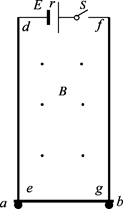 2、简答题  (20分)如图所示,de和fg是两根足够长且固定在竖直方向上的光滑金属导轨,导轨间距离为L,电阻忽略不计。在导轨的上端接电动势为E,内阻为r的电源。一质量为m、电阻为R的导体棒ab水平放置于导轨下端e、g处,并与导轨始终接触良好。导体棒与金属导轨、电源、开关构成闭合回路,整个装置所处平面与水平匀强磁场垂直,磁场的磁感应强度为B,方向垂直于纸面向外。已知接通开关S后,导体棒ab由静止开始向上加速运动,求:
