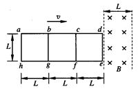 2、简答题 如图所示,由10根长度都是L的金属杆连接成的一个“目”字型的矩形金属框abcdefgh,放在纸面所在的平面内。有一个宽度也为L的匀强磁场,磁场边界跟de杆平行,磁感应强度的大小是B,方向垂直于纸面向里,金属杆ah、bg、cf、de的电阻都为r,其他各杆的电阻不计,各杆端点间接触良好。现以速度v匀速地把金属框从磁场的左边界水平向右拉,从de杆刚进入磁场瞬间开始计时,求:(1)从开始计时到ah杆刚进入磁场的过程中,通过ah杆某一横截面总的电荷量q;(2)从开始计时到金属框全部通过磁场的过程中,金属框中电流所产生的总热量Q。