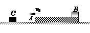 1、计算题 (10分)如图所示,长木板A上右端有一物块B,它们一起在光滑的水平面上向左做匀速运动,速度v0=2m/s。木板左侧有一个与木板A等高的固定物体C。已知长木板A的质量为mA=1.0kg,物块B的质量为mB=3.0kg,物块B与木板A间的动摩擦因数μ=0.5,取g=10m/s2。