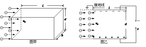 3、计算题 (22分)如图甲所示,静电除尘装置中有一长为L、宽为b、高为d的矩形通道,其前、后面板使用绝缘材料,上、下面板使用金属材料。图乙是装置的截面图,上、下两板与电压恒定的高压直流电源相连。质量为m、电荷量为-q、分布均匀的尘埃以水平速度v0进入矩形通道,当带负电的尘埃碰到下板后其所带电荷被中和,同时被收集。通过调整两板间距d可以改变收集效率η。当d=d0时η为81%(即离下板081d0范围内的尘埃能够被收集)。不计尘埃的重力及尘埃之间的相互作用。