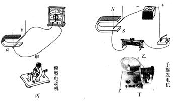 选择题 如下图所示是演示电磁学原理及其应用的示意图。以下说法中正确的是A.利用甲实验的原理可制成丙装置B.利用乙实验的原理可制成丁装置C.丙装置可将内能转化为电能D.丁装置可将机械能转化为电能