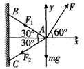 参考答案:解:设AB的张力为F1,AC的张力为F2,建立如图所示的直角坐标系,对物体进行受力分析,根据平衡条件得: