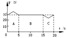 5、实验题 某同学利用DIS研究电梯在竖直方向的运动。在电梯中挂一质量为3kg的重物,用力传感器测出悬绳的拉力F,得到如图所示的F-t图象。
