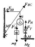 3、计算题  如图所示,轻杆BC的C点用光滑铰链与墙壁固定,杆的B点通过水平细绳AB使杆与竖直墙壁保持30°的夹角,若在B点悬挂一个质量不计的定滑轮,某人用它匀速地提起重物。已知重物的质量m=30kg,人的质量M=50kg,g=10m/s2。 试求: