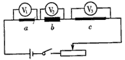 3、选择题 如图所示,a、b、c为同一种材料做成的电阻,b与a的长度相等,横截面积是a的两倍;c与a的横截面积相等,长度是a的两倍。当开关闭合后,三个理想电压表的示数关系是