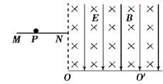 2、计算题 如图所示,质量为2 g的小球,带有1×10?C负电荷,静置于水平绝缘桌面MN上的P点,P距桌面右端点N的距离为0.5 m,小球与水平桌面之间的动摩擦因数为0.1,桌面MN距水平面OO′的高度为1.2 m.过N点的竖直虚线右侧存在互相正交的匀强电场和匀强磁场,电场方向竖直向下,场强E=20 N/C,磁场方向水平向里,磁感应强度B=2.5 T.现突然在桌面正上方加一场强也为E,方向水平向左的匀强电场,使小球沿MN运动,最终落到水平面OO′上.g取10 m/s