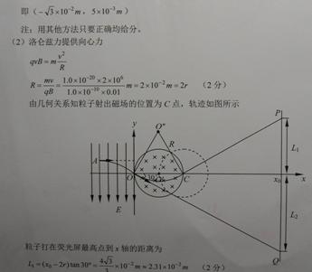 3、计算题 (16分)如图所示,xoy平面内,y轴左侧有方向竖直向下,电场强度为E=1.0×1 04 N/的匀强电场。在Y轴右侧有一个边界为圆形的匀强磁场区域,圆心O’位于x轴上,半径为r=0.01 m,磁场最左边与Y轴相切于O点,磁感应强度为B=0.01T,方向垂直纸面向里。在坐标xo=0.06m处有垂直于x轴的足够大的荧光屏PQ。一束带正电的粒子从电场中的A点(图中未标出)以垂直于电场的初速度向右运动,穿出电场时恰好通过坐标原点,速度大小为v="2" ×106m/s,方向与x轴正向成300角斜向下。已知粒子的质量为m=1.0×l0-2kg,电量为q=1.0×10-10C,重力不计。