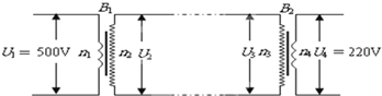 5、简答题 如图所示,一小型发电站通过升压变压器B1和降压变压器B2把电能输送给用户(B1和B2都是理想变压器),已知发电机的输出功率为500kW,输出电压为500V,升压变压器B1原、副线圈的匝数比为1:10,两变压器间输电导线的总电阻为2Ω.降压变压器B2的输出电压为220V.求:
