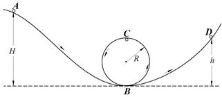 5、选择题 如图所示,一个小球(视为质点)从H=12 m高处,由静止开始沿光滑弯曲轨道AB,进入半径R=4 m的竖直圆环内侧,且与圆环的动摩擦因数处处相等,当到达圆环顶点C时,刚好对轨道压力为零;然后沿CB圆弧滑下,进入光滑弧形轨道BD,到达高度为h的D点时速度为零,则h的值可能为