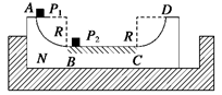 的1/4圆弧面,A和D分别是圆弧的端点,BC段表面粗糙,其余段表面光滑,小滑块P1和P2的质量均为m,滑板的质量M=4m.P1和P2与BC面的动摩擦因数分别为μ1=0.10和μ2=0.40,最大静摩擦力近似等于滑动摩擦力,开始时滑板紧靠槽的左端,P2静止在粗糙面的B点。P1以v0="4.0" m/s的初速度从A点沿弧面自由滑下,与P2发生弹性碰撞后,P1停在粗糙面B点上,当P2滑到C点时,滑板恰好与槽的右端碰撞并与槽牢固粘连,P2继续滑动,到达D点时速度为零,P1与P2可视为质点,取g="10" m/s2。问: