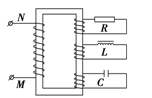 本题解析:若初级线圈两端M、N接正弦式交流电,三组次级线圈中都有感应电动势产生,三个线圈中都会有电流,只不过自感线圈中还会产生感应电动势,电容器不断进行充放电,也会有电流产生.