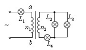 1、选择题 如图为理想变压器,三个灯泡L1、L2、L3都标有“5V,5W”,L4标有“5V,10W”,若它们均正常发光,则变压器原、副线圈匝数比n1∶n2和ab间电压分别为