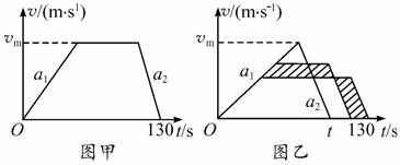 匀减速运动直到停止,行程1600 m不变时,时间最短。如图乙所示,设最短时间为t,则