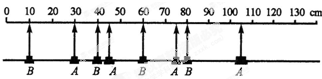 2、选择题 为了验证碰撞中的动量守恒,实验宜在气垫导轨上进行,这样就可以大大减小阻力,使滑块在碰撞前后的运动可以看成是匀速运动,使实验的可靠性及准确度得以提高,在某次实验中,A、B两铝制滑块在一个水平气垫导轨上相碰,用闪光照相每隔0.2s的时间拍摄一次照片,每次拍摄闪光的延续时间很短,可以忽略不计,如图所示,已知A、B之间的质量关系是mB=1.5mA,拍摄进行了4次,第一次是在两滑块相撞之前,以后的三次是在碰撞之后,A原来处于静止状态,设A、B滑块在拍摄闪光照片的这段时间内是在10cm至105cm这段范围内运动,(以滑块上的箭头位置为准),根据闪光照片得出的结论中说法正确的是( )