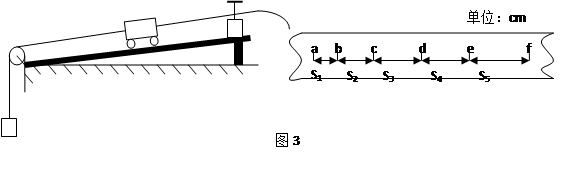 4、实验题 在探究“恒力做功与动能改变的关系”的实验中,某同学采用如下图3装置,小车质量M,在平衡摩擦力之后,挂上重物m后,小车拖动纸带并打出一系列的点。图中的纸带只是打出的纸带的一部分,所标注的点相邻两点的时间间隔为T。使用毫米刻度尺进行测量后,将数据记录在图中。则:(重力加速度为g)