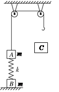 4、计算题 (10分)如图所示,物体A经一轻质弹簧与下方地面上的物体B相连,物体A、B的质量均为m,弹簧的劲度系数为k,A、B都处于静止状态。一条不可伸长的轻绳绕过轻滑轮,一端连物体A,另一端连一轻挂钩,开始时各段绳都处于伸直状态,A上方的一段绳沿竖直方向。现在挂钩上挂一物体C并从静止状态开始释放,已知物体B刚离开地面时,物体A恰好获得最大速度,重力加速度为g,求: