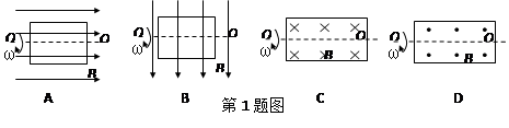 4、选择题 如图所示,下列四种情况均表示闭合线圈在匀强磁场中绕轴匀速转动,在下列情况下线圈中不能产生交流电的是(从左侧看线圈绕OO′顺时针转动)