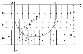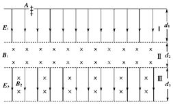已知能飞回区域Ⅰ的带电粒子的质量为m=6.4×10-27kg,带电荷量为q=3.2×10-19C,且d1=10cm,d2=5cm,d3>10cm,E1=E2=40V/m,B1=4×10-3T,B2=2×10-3T.