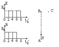 4、简答题 某空间存在着一个变化的电场和另一变化的磁场,电场方向向右(即图中由B到C的方向),电场大小变 化如E-t图象,磁感强度的变化如B-t图象.在A点,从t=1s(即1秒末)开始每隔2s有一相同带电粒子(重力不计)沿AB方向(垂直于BC)以速度v射出,恰都能击中C点,若AC=2BC,且粒子在AC间运动的时间小于1s.求: