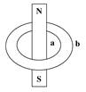 3、选择题 如图所示,两个同心放置的共面金属圆环a和b,一条形磁铁穿过圆心且与环面垂 直,则穿过两环的磁通量Фa和Фb大小关系为(? )?