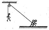 4、计算题  (16分)广州亚运会开幕式文艺表演最震撼人心的节目当数《白云之帆》篇章,是由地面上近1400人用绳索拉着的180名演员上演“空中飞人”。9分钟的时间里,180名塔沟武校的武林小子在帆屏上时而俯冲而下,时而攀缘升空,演绎了一场世所罕见的惊险、刺激却又浪漫、温馨的节目.现在把他们某次训练过程中的情节简化成模型:如图所示,地面上的人通过定滑轮用轻绳将质量m="60" kg的演员从静止竖直向上拉高24 m,用时t="6" s,演员在竖直方向上先做匀加速直线运动,再做匀减速直线运动后静止在高空。其加速和减速过程中的加速度之比为1∶5,忽略滑轮的质量和滑轮与轴之间的摩擦力.求: