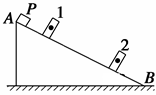 3、填空题  利用图所示的装置研究匀变速直线运动.图中AB是固定的光滑斜面,1和2是固定在斜面上适当位置的两个光电门,当光电门中有物体通过时与它们连接的光电计时器(都没有画出)能够显示挡光时间.让滑块从斜面的顶端滑下,光电门1、2各自连接的光电计时器显示的挡光时间分别为5.00×10-2s、2.00×10-2s.已知滑块沿斜面方向的长度为5.00cm,测得光电门1和2之间的距离为0.54 m。求:(结果要求保留两位有效数字)