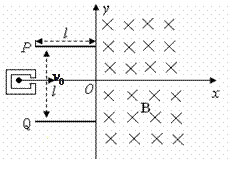 1、简答题 如图所示,建立xOy坐标系,两平行极板P、Q垂直于y轴且关于x轴对称,极板长度和板间距均为l,两板间电压大小为U;第一、四象限有磁感应强度为B的匀强磁场,方向垂直于xOy平面向里。位于极板左侧的粒子源沿x轴向右发射一个质量为m、电量为+q、重力不计的带电粒子,带电粒子恰好经极板边缘射入磁场。上述m、q、l、U、B为已知量。(不考虑极边缘的影响)。求