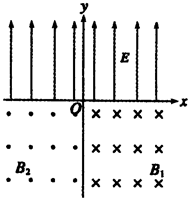 2、计算题 (14分)在xOy平面第Ⅰ、Ⅱ象限中,存在沿y轴正方向的匀强电场,场强为E=,在第Ⅲ、Ⅳ象限中,存在垂直于xOy平面方向的匀强磁场,如图所示,磁感应强度B1=B,B2=2B.带电粒子a、b分别从第Ⅰ、Ⅱ象限的P、Q两点(图中没有标出)由静止释放,结果两粒子同时分别进入匀强磁场B1、B2中,再经过时间t第一次经过y轴时恰在点M(0,-