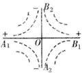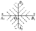 2、选择题  理论研究表明,无限大的 均匀带电平面在周围空间会形成与平面垂直的匀强电场。现有两块无限大的均匀绝缘带电平面,一块两面正电,一块两面负电,把它们正交放置如图所示,单位面积所带电荷量相等(设电荷在相互作用时不移动),图中直线A1B1和A2B2分别为带正电平面和带负电平面与纸面正交的交线,O为两交线的交点,则下图中能正确反映等势面分布情况的是
