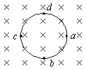 1、选择题 如图所示,匀强磁场垂直于圆形线圈指向纸里, a、b、c、d为圆形线圈上等距离的四点,现用外力作用在上述四点,将线圈拉成正方形.设线圈导线不可伸长,且线圈仍处于原先所在的平面内,则在线圈发生形变的过程中?(?)