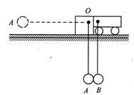 1、计算题 如图所示,质量为0.3kg的小车静止在足够长的光滑轨道上,小车下面挂一质量为0.1kg的小球B,在旁边有一支架被固定在轨道上,支架上O点悬挂一质量也为0.1kg的小球A。两球球心至悬挂点的距离L均为0.2m,当两球静止时刚好相切,两球球心位于同一水平线上,两悬线竖直并相互平行。将A球向左拉至悬线水平时由静止释放与B球相碰,碰撞过程中无机械能损失,两球相互交换了速度,取